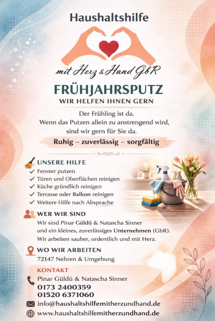 Wir, eure Haushaltshilfe mit Herz & Hand GbR, unterstützen Sie gerne bei Ihrem Frühjahrsputz – zuverlässig, sorgfältig und mit viel Herz.
